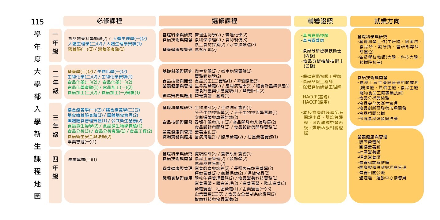 - • 職場實務與應用:學校午餐管理實務 / 營養實習(膳食/臨床/社區) / 企業實習 / 食品安全管制系統應用 / 智慧科技與食品營養